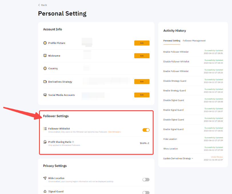 Щоб налаштувати коефіцієнт розподілу прибутку, перейдіть у Центр користувача (майстер-трейдер) → Персональні налаштування → Налаштування підписників → Коефіцієнт розподілу прибутку.