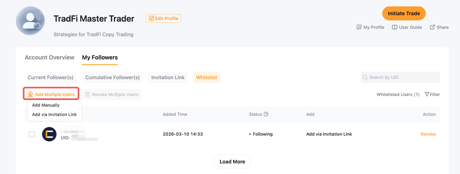 Копітрейдинг TradFi пропонує дві функції — «Запрошувальне посилання» та «Білий список підписників», — які дають змогу майстер-трейдерам керувати тим, хто може копіювати їхні угоди.