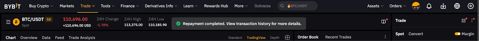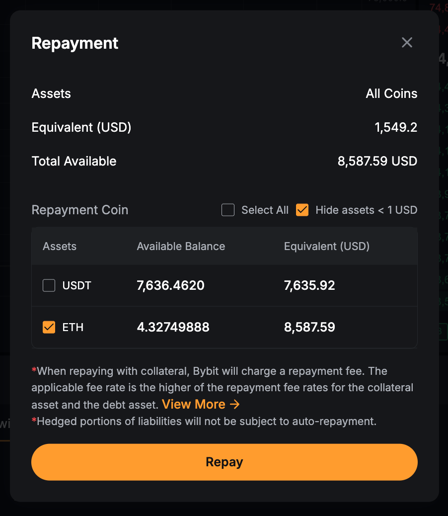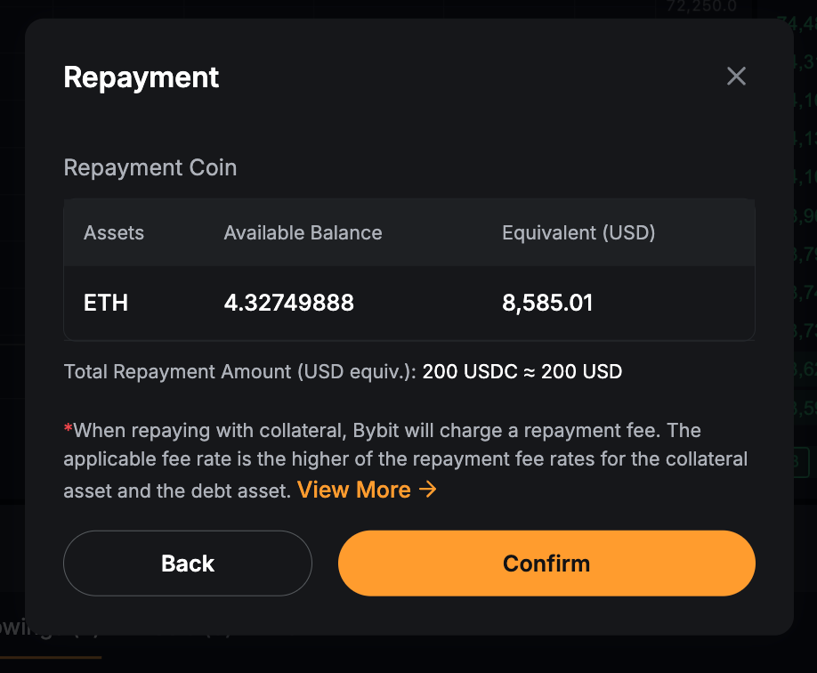 Після підтвердження система спочатку використає вашу наявну запозичену монету для погашення. Будь-які зобов'язання, що залишилися, будуть погашені шляхом конвертації активів застави у позикову валюту. Якщо для погашення потрібна конвертація, Bybit стягує комісію за обробку із загальної суми погашення. Ставка комісії — це вища зі ставок комісії за погашення для заставного активу та боргового активу.