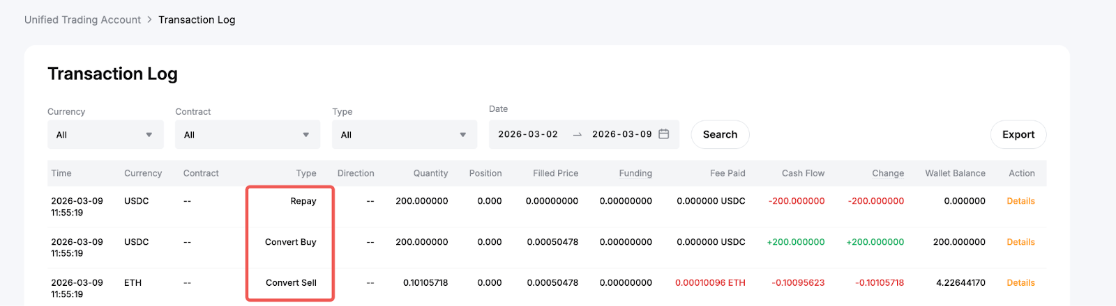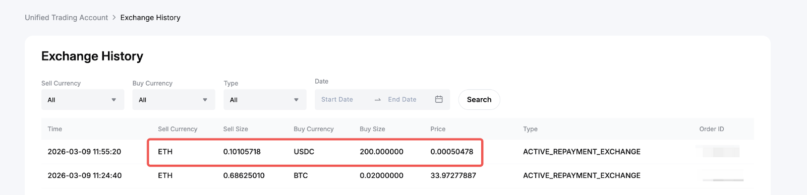 У своєму Журналі транзакцій ви можете знайти деталі кожного погашення в розділі типів транзакцій конвертації та погашення, які відповідно перелічені з однаковими відмітками часу та номерами ордерів. Операції з конвертації вказують на будь-яку автоматичну конвертацію вибраних заставних активів для погашення суми позики. Вони з'явиться, лише якщо на вашому балансі недостатньо запозиченої монети для погашення, і конвертації необхідні. Тим часом транзакції погашення відображають суму, яку ви сплатили за запозичену монету.