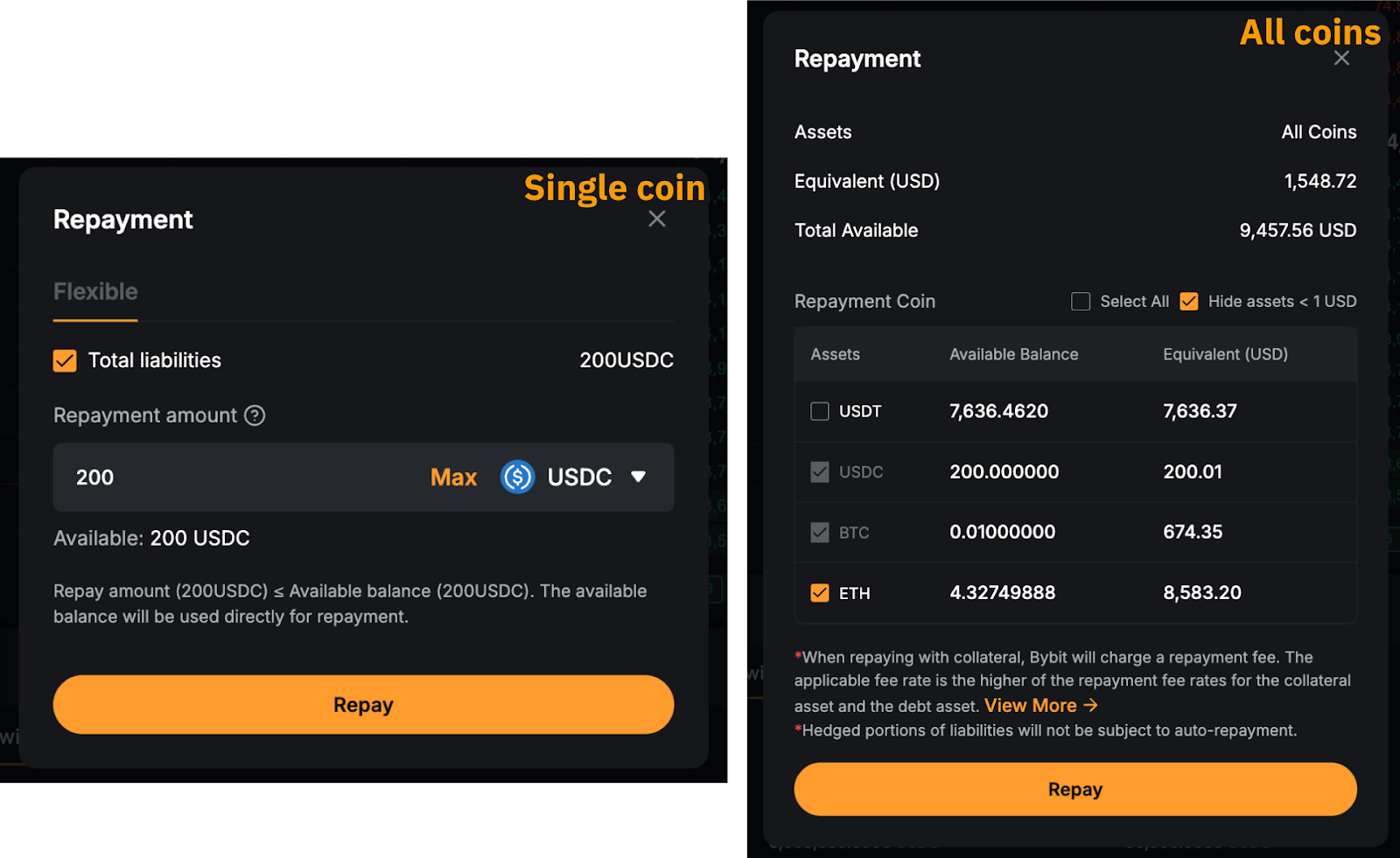 — Тепер підтримуються повні, часткові та змішані погашення (позичена монета + конвертація). Однак зверніть увагу, що будь-які погашення, здійснені шляхом переказу активів або Спотової торгівлі (тобто продаж інших активів маржі в позикову монету), виплачують лише непогашену суму ваших Деривативних зобов'язань. Будь-які Спотові зобов’язання залишаться та повинні бути сплачені вручну.