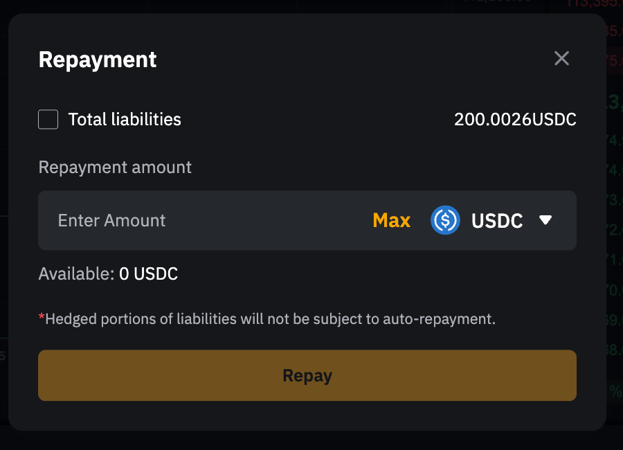 Примітка: Якщо у вашому доступному балансі є запозичена монета, актив буде автоматично вибрано для погашення.