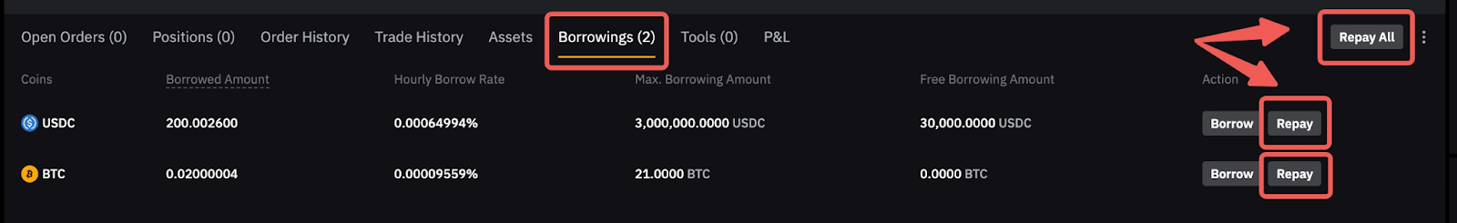 Крім того, ви також можете отримати доступ до кнопки Погасити на сторінці Спотової маржинальної торгівлі → Позики.