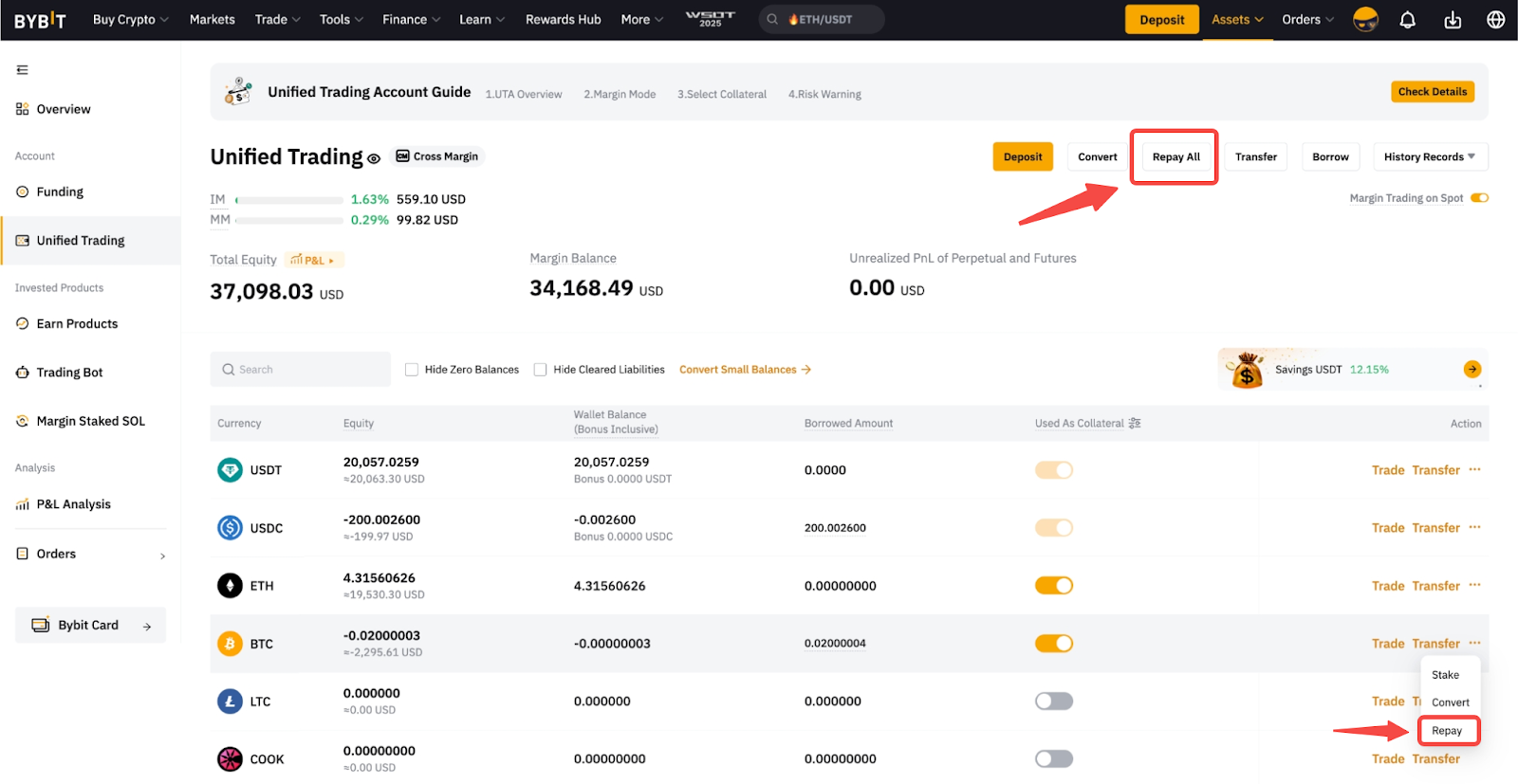 - Щоб погасити всі запозичені монети, натисніть Погасити все у верхній частині сторінки Єдиного торгового акаунта.