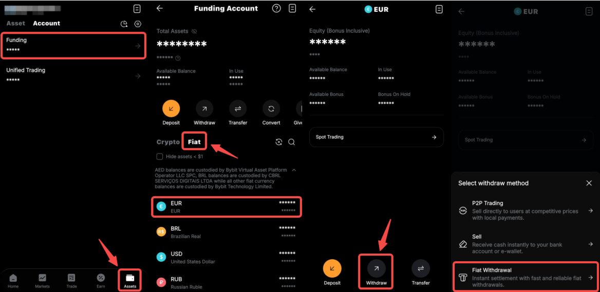 Щоб вивести фіатну валюту, перейдіть на сторінку Активи і виберіть Акаунт фінансування, натисніть Фіат і виберіть фіатну валюту, яку хочете вивести, натисніть Вивести → Виведення фіату. Процедури виведення коштів у різних фіатних валютах дещо відрізняються. Для отримання додаткової інформації відвідайте цей посібник.