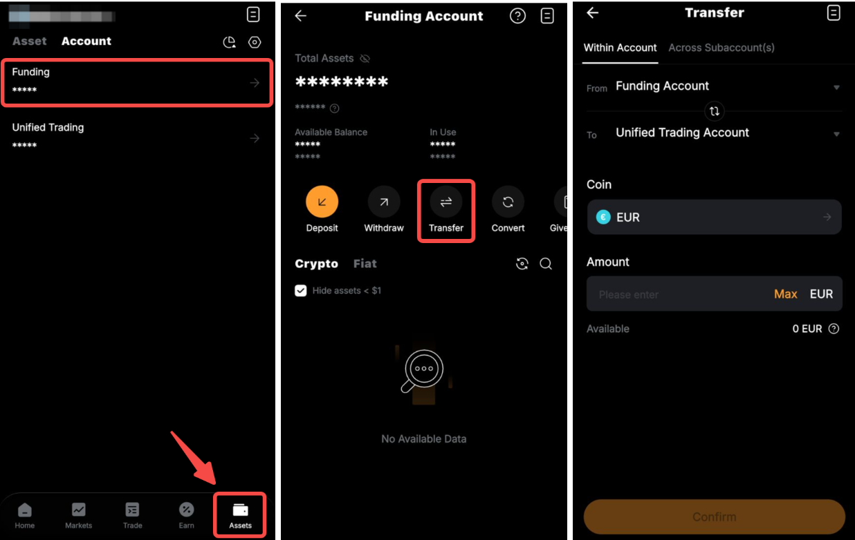 Перейдіть на сторінку Активи та виберіть Акаунт фінансування. Натисніть Переказ, щоб перейти на сторінку переказу. Переконайтеся, що вибрані акаунти та фіатна валюта правильні, потім введіть суму для переказу. Далі натисніть Підтвердити.