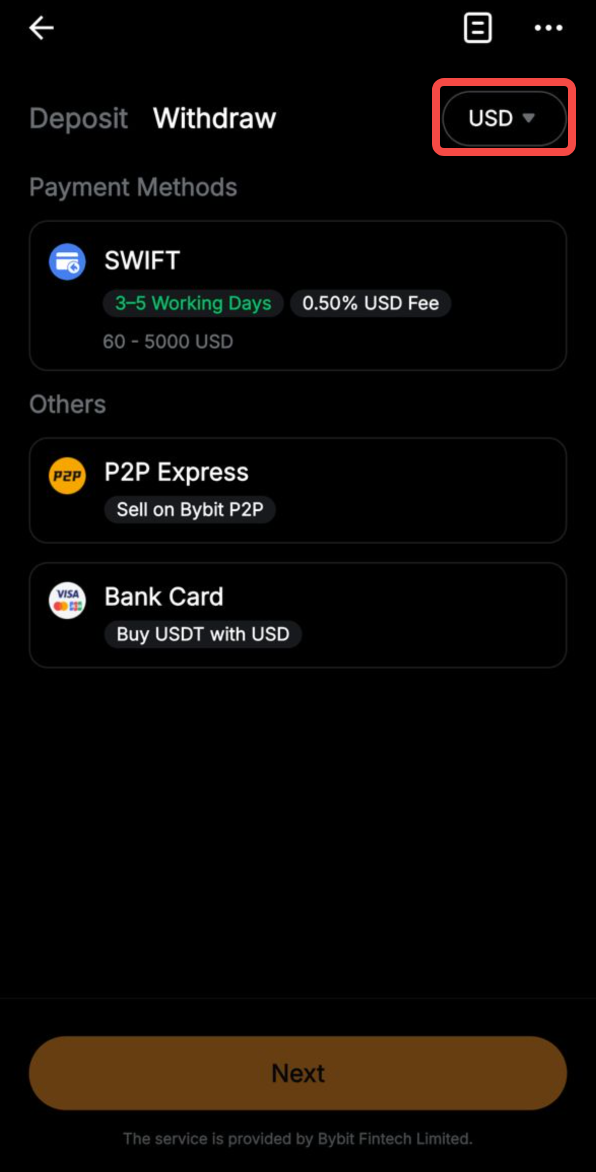 Bybit підтримує депозити у кількох фіатних валютах, якими можна торгувати одразу після їх зарахування на фіатний баланс. Процедура поповнення різних фіатних валют дещо відрізняється. Докладніше дивіться тут.