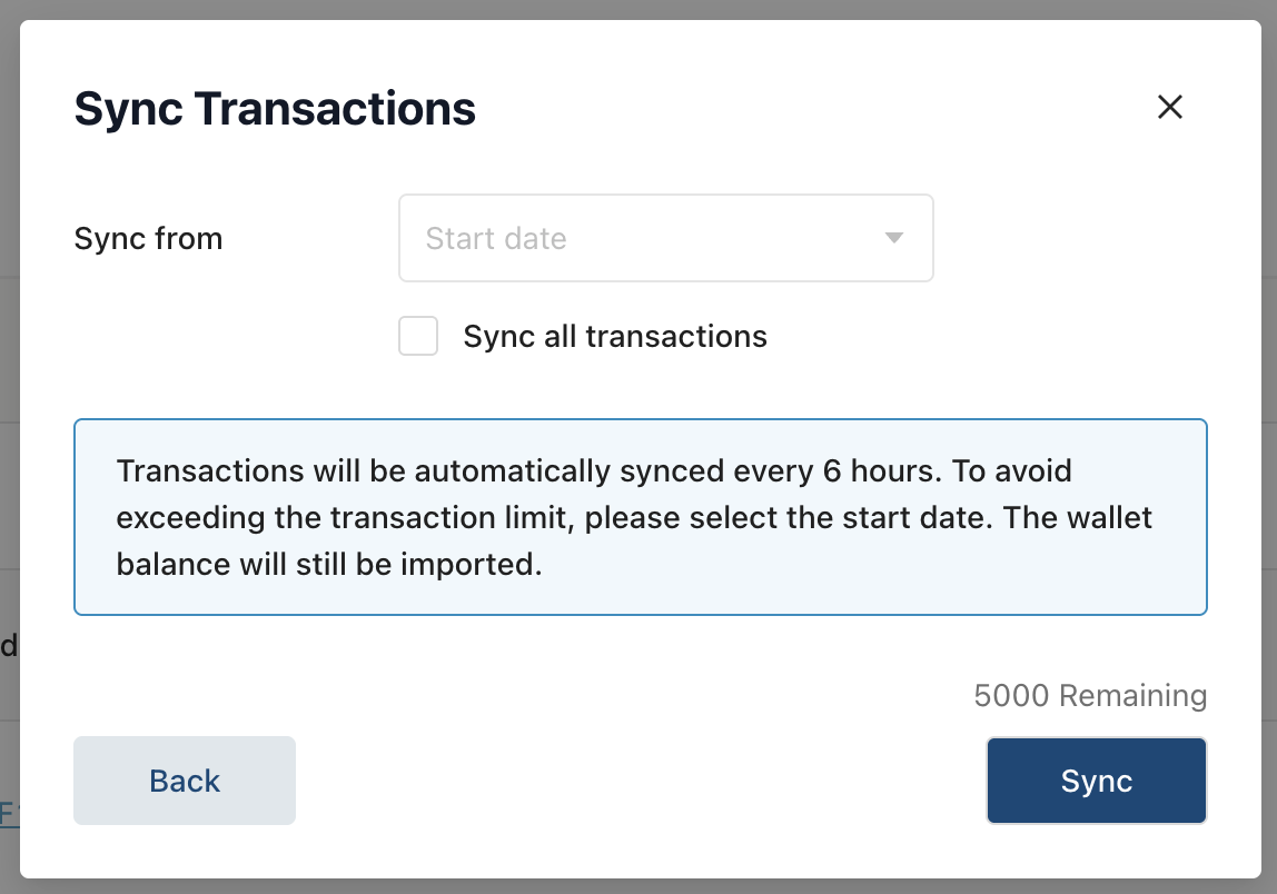 Крок 7: Після підключення Journaler запитає вас, які гаманці підключити, і дозволить вибрати дату початку.