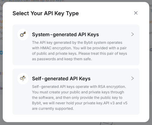 Крок 2: Натисніть Створити новий ключ. З’явиться спливаюче вікно, у якому можна вибрати тип ключа API, що найкраще відповідає вашим торговим потребам.