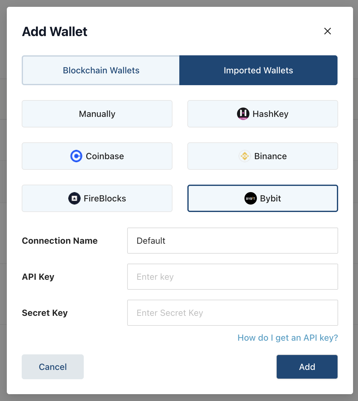 Крок 6: У спливаючому вікні виберіть Bybit і введіть інформацію про щойно створений ключ API Bybit. Вам потрібно буде ввести:
