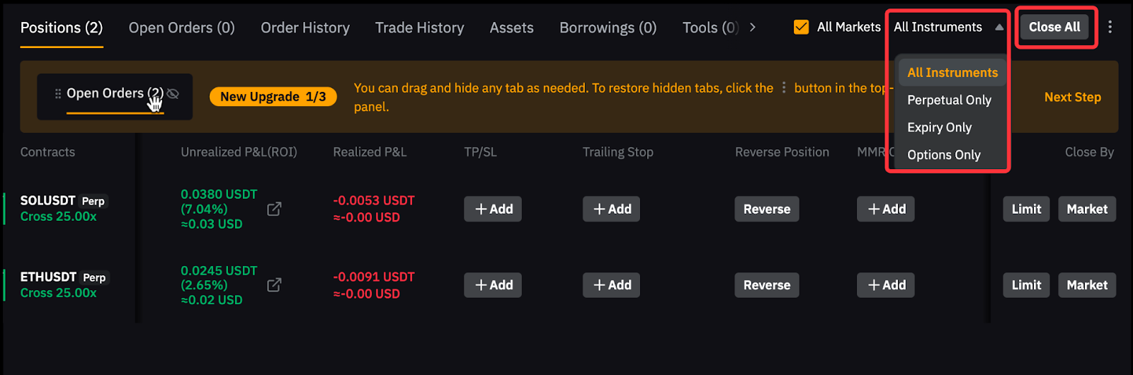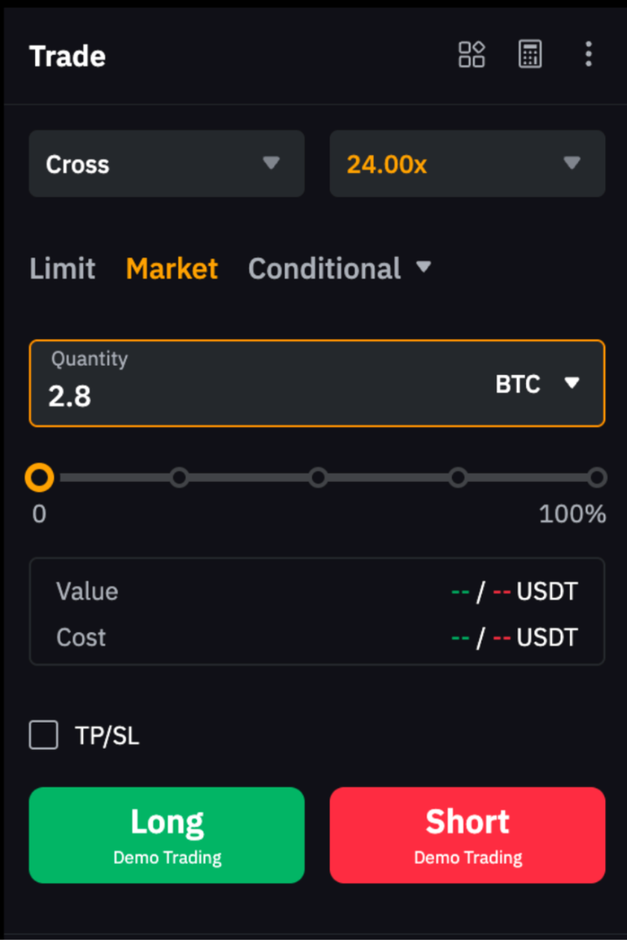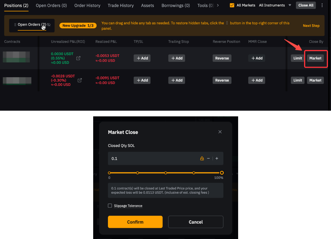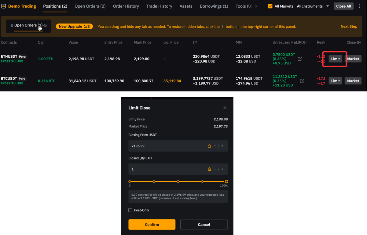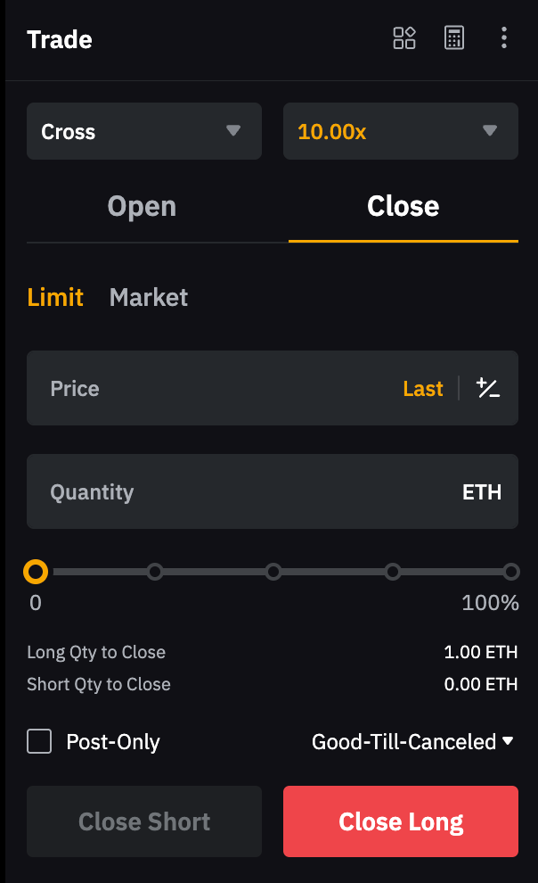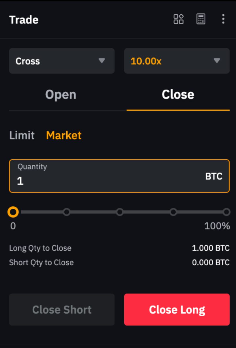 Наприклад, щоб закрити довгу позицію на 1 BTC, розмістіть короткий ринковий ордер на 1 BTC. Зверніть увагу, що якщо кількість ордера перевищує розмір вашої поточної позиції, може бути відкрита нова позиція у протилежному напрямку.