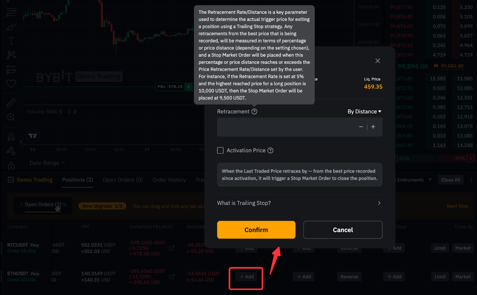 Трейлінг стоп-ордер динамічно коригує стоп-ціну відповідно до ринкових коливань, допомагаючи вам зафіксувати прибуток, одночасно обмежуючи потенційний ризик просадки. Для отримання додаткової інформації перегляньте статтю Трейлінг стоп-ордери (торгівля безстроковими та ф'ючерсними контрактами).