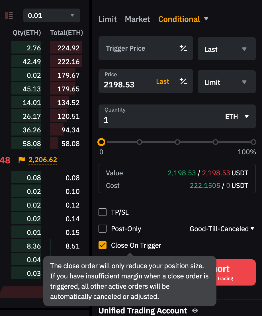 Примітка: Якщо кількість ордера перевищує розмір вашої поточної позиції, може бути відкрита нова позиція у протилежному напрямку. Щоб уникнути цього, ви можете ввімкнути Скорочення позиції для лімітного ордера або Закрити по тригеру для умовного ордера.