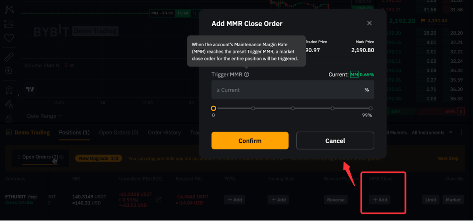 При закритті за MMR буде автоматично розміщено ринковий ордер на повне закриття вибраної позиції, якщо ставка підтримувальної маржі (MMR) на вашому акаунті досягне встановленого рівня спрацьовування. Для отримання додаткової інформації перегляньте Ордер закриття за ставкою підтримувальної маржі (MMR).