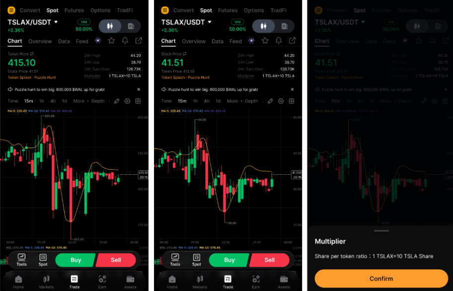 Щоб вирішити цю проблему, Bybit запроваджує механізм множника для торгівлі xStocks. Цей множник оновлюється щоразу, коли відбувається дроблення акцій, зворотне дроблення або виплата дивідендів, щоб відобразити оновлену кількість базових часток, представлених кожним токеном.