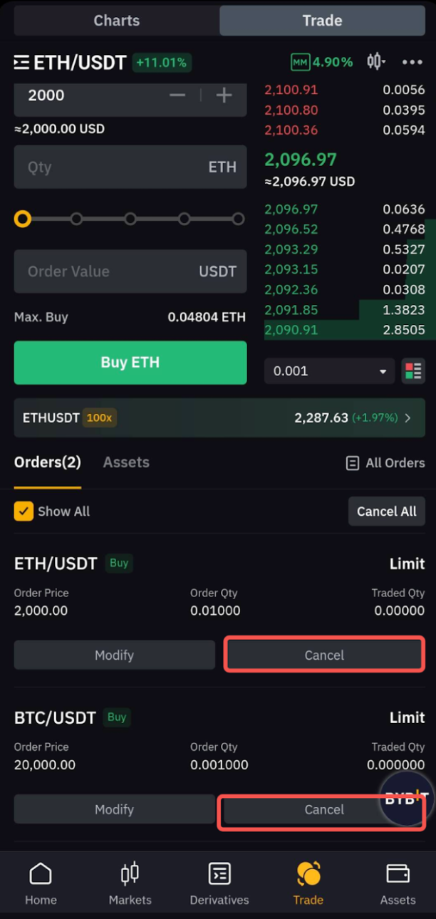 Важливо зазначити, що якщо ви вибрали опцію Показати всі, натискання на Скасувати всі скасує ордери для всіх торгових пар.