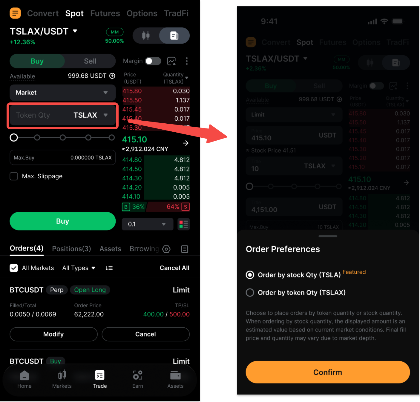 Користувачі також можуть перемикатися між ціною токена та ціною базової акції за допомогою перемикача з подвійною стрілкою на сторінці торгівлі, сторінці розміщення ордера або сторінці історії ордерів.