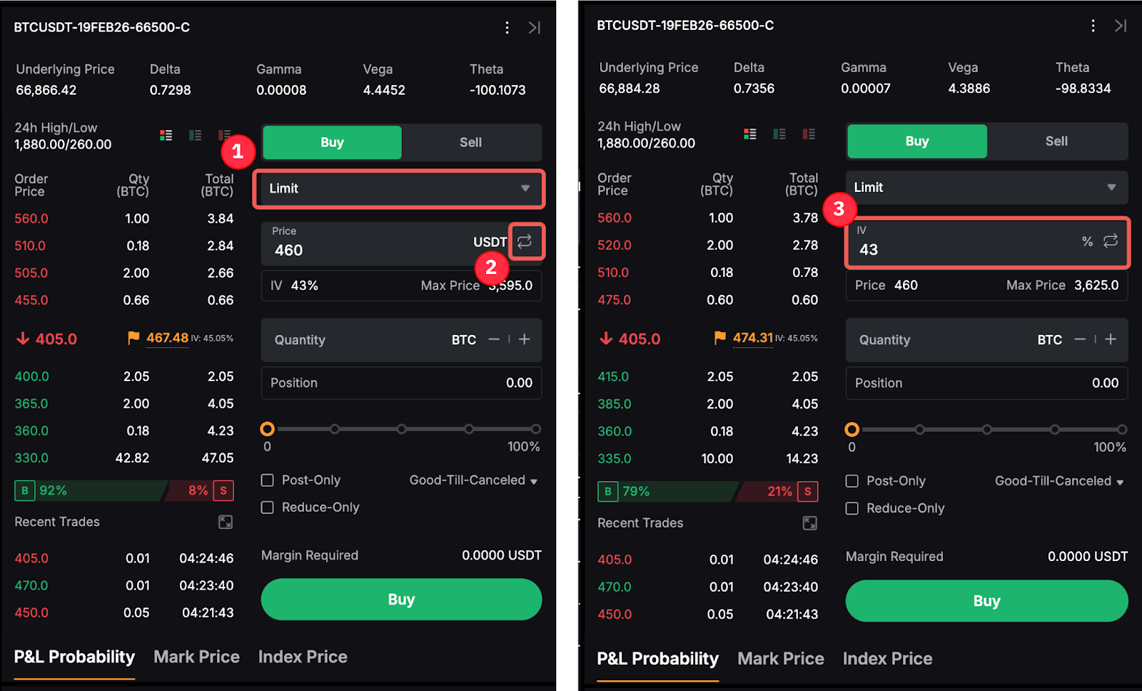 Щоб розмістити ордер безпосередньо відповідно до IV, потрібно перемкнути Відсоток IV у розділі Ліміт на сторінці ордера на опціони. Для отримання додаткової інформації див. статтю Як почати торгувати опціонами на Bybit.