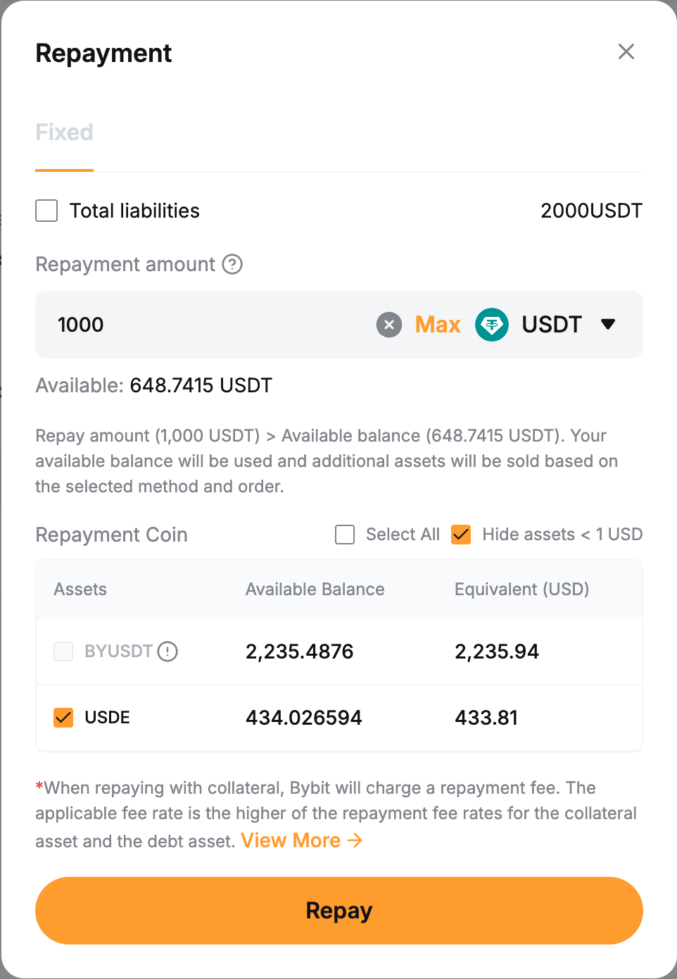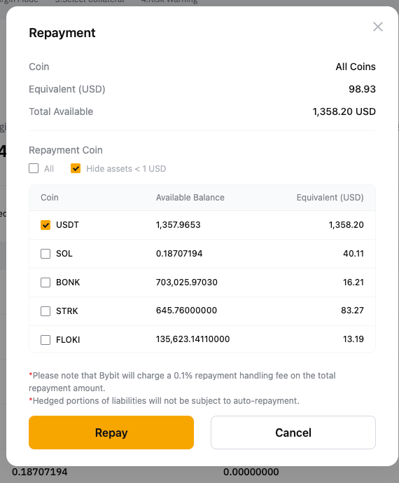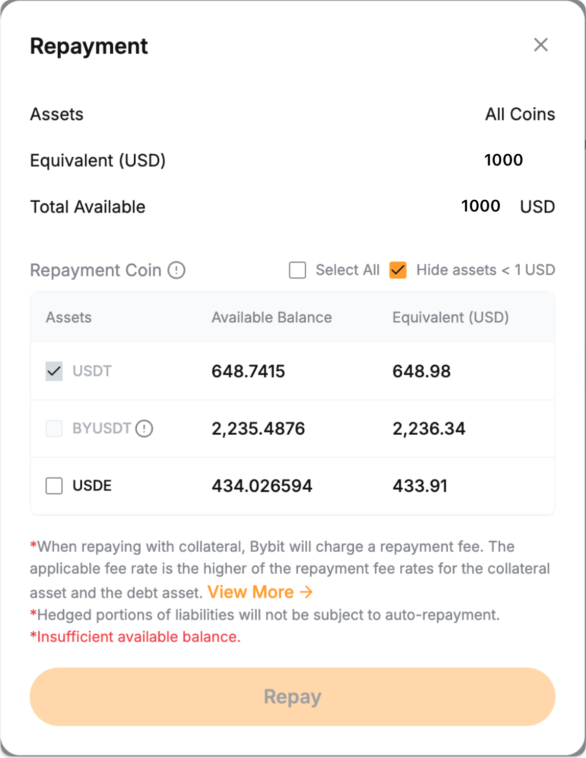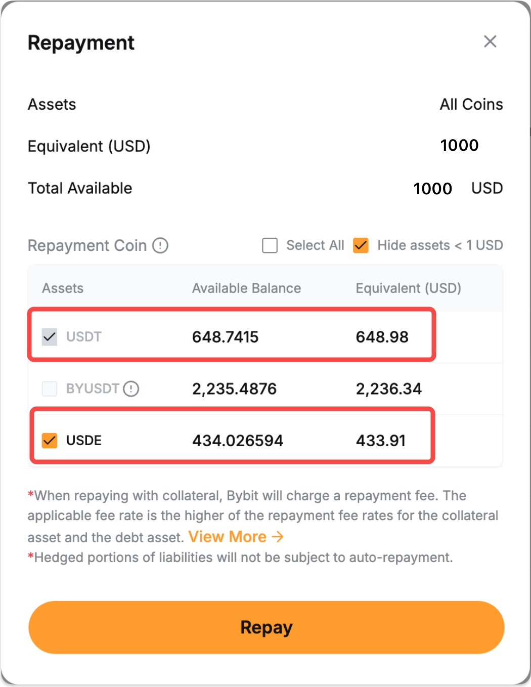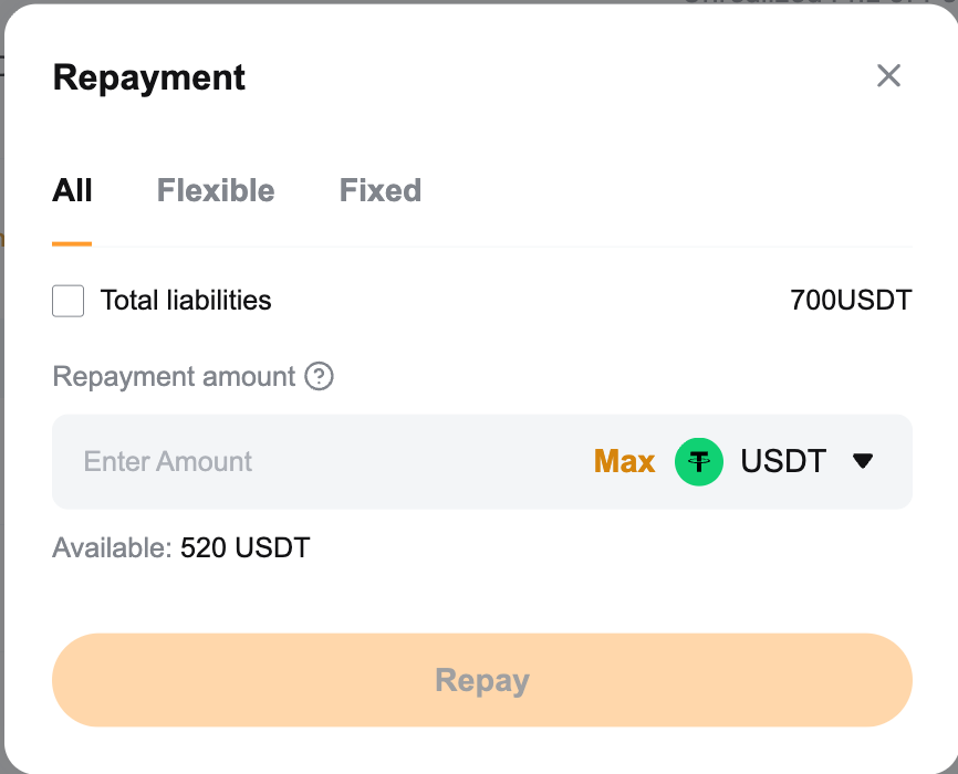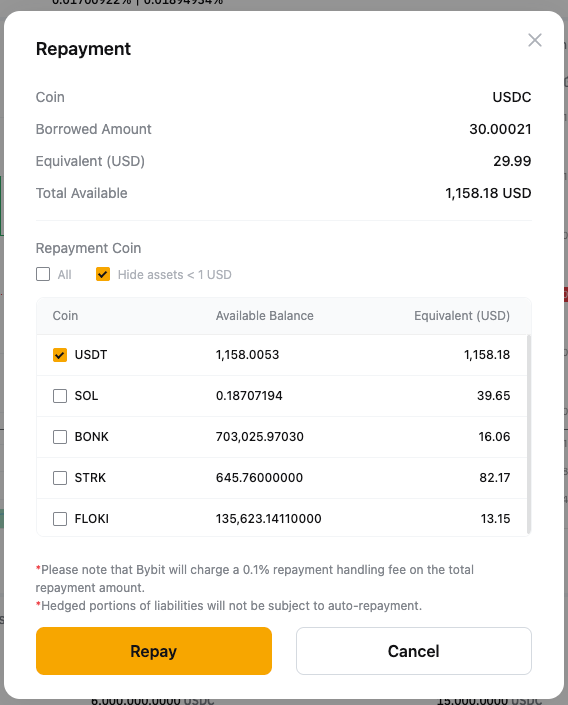 Якщо у вас недостатньо позичених монет, ви можете здійснити повне погашення за допомогою інших заставних активів. Система конвертує заставу для погашення позичених монет, і буде стягнуто комісію за обробку. Ставка комісії — це вища зі ставок комісії за погашення для заставного активу та боргового активу. |