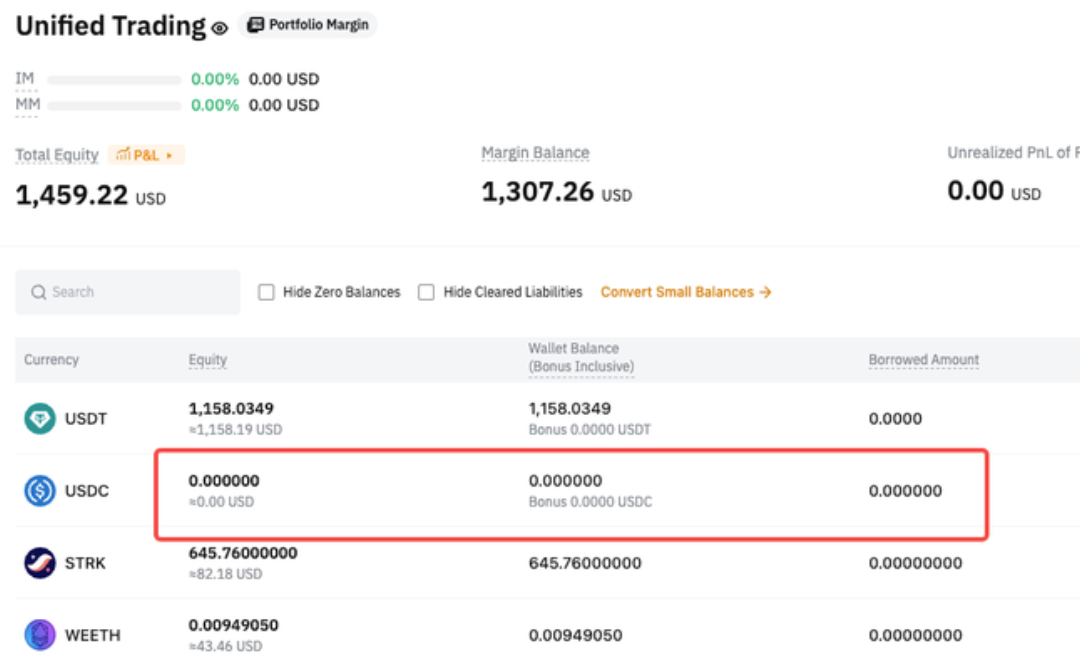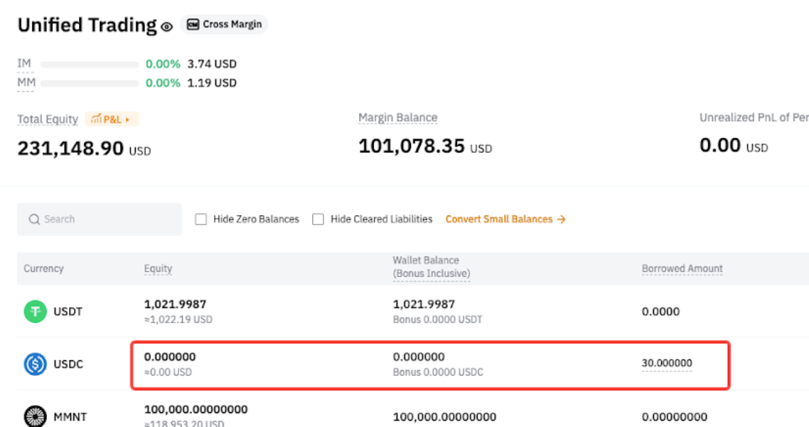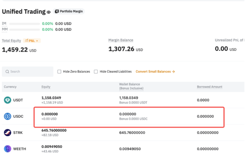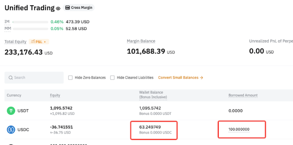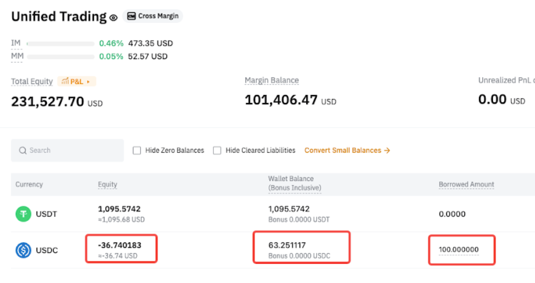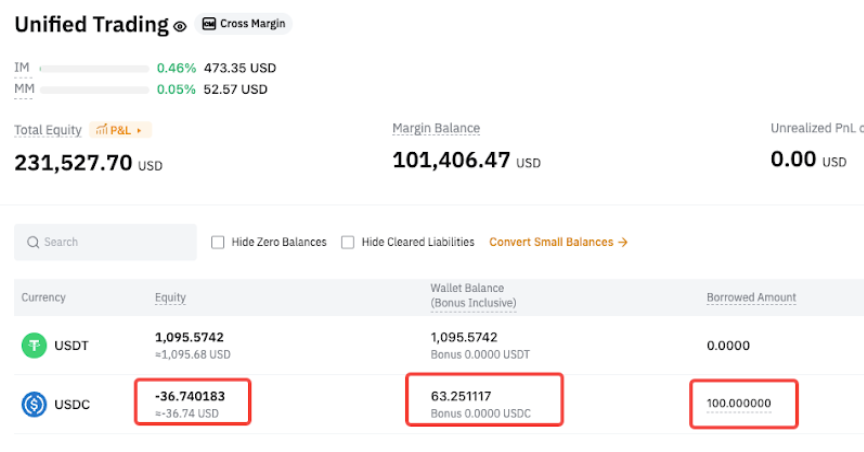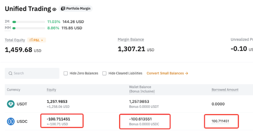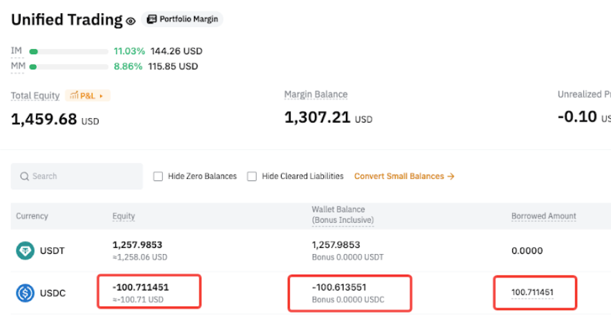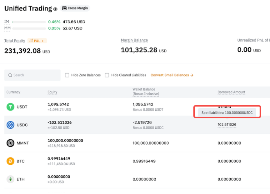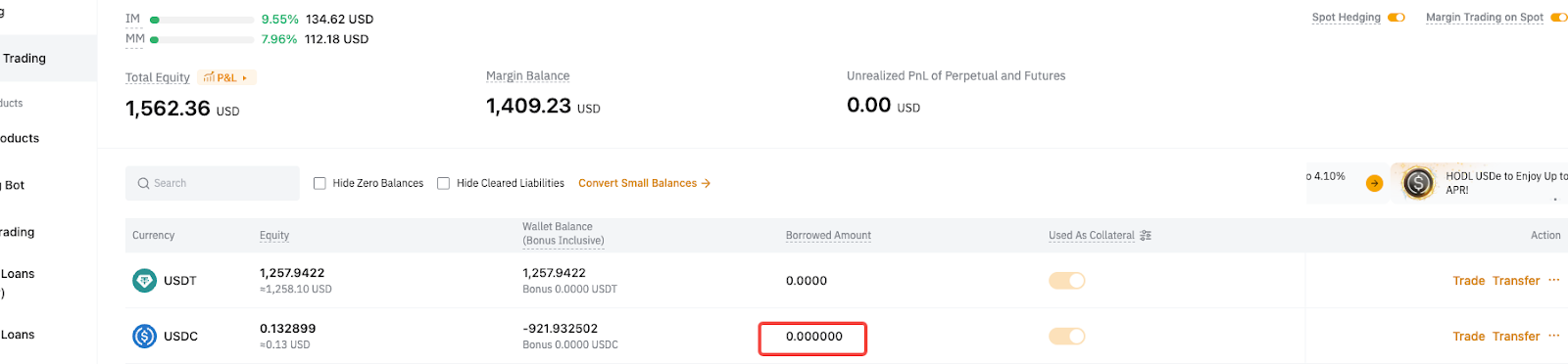 Після переказу в USDC лише дериватні зобов’язання погашаються автоматично, тоді як Спотові зобов’язання залишаються несплаченими. - Спотові зобов'язання = 100