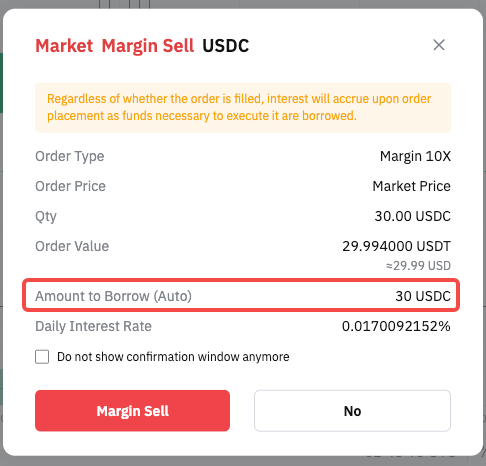 Приклад Ви розміщуєте Спотовий Маржинальний ордер, який виконується негайно. Система автоматично позичає необхідну суму. | Підтримується. Баланс гаманця показує нуль, а позичена сума фіксується.