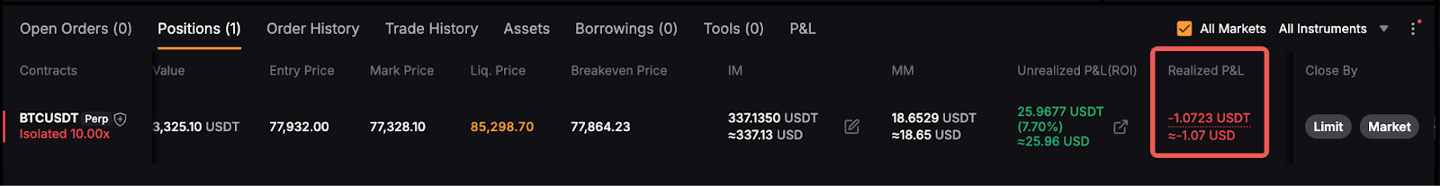 Коли трейдер нарешті закриває позицію, P&L стає реалізованим і фіксується на вкладці «Закритий P&L» сторінки «Активи». У цьому розрахунку є деякі суттєві відмінності від нереалізованого P&L. Нижче підсумовані відмінності між нереалізованим P&L і закритим P&L.