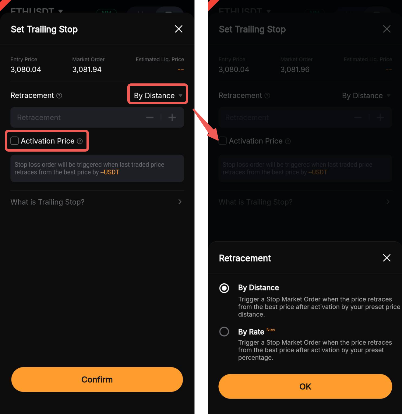 - Якщо ціна активації встановлена, трейлінг стоп-ордер активується лише після досягнення ціни активації. Якщо ціна активації не встановлена, трейлінг стоп-ордер буде активовано негайно на основі поточної ціни останньої угоди після розміщення ордера.