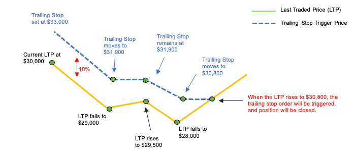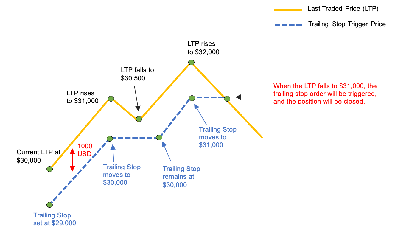 - Якщо ціна останньої угоди ніколи не перевищує 30 000 USD, трейлінг стоп-ордер спрацьовує на рівні 29 000 USD, подібно до звичайного стоп-лоссу.