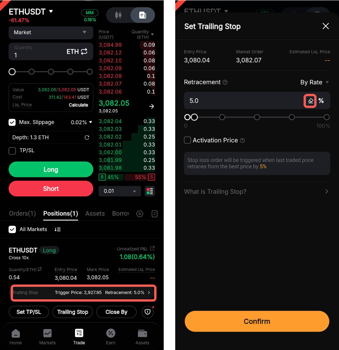 Використовуючи функцію ціни активації для трейлінг стоп-ордера в торгівлі безстроковими та ф'ючерсними контрактами, ви також можете активувати трейлінг стоп-ордер лише тоді, коли позиція прибуткова, що називається трейлінг прибутком.