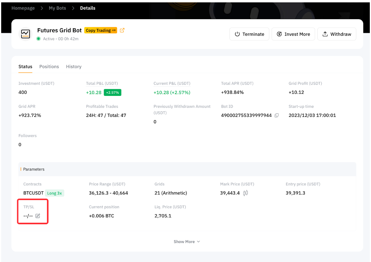 Ngoài ra, bạn cũng có thể thiết lập TP/SL cho bot đang chạy của mình từ trang chi tiết về bot. Xin lưu ý rằng việc đầu tư thêm tiền vào hoặc rút lợi nhuận từ bot của bạn sẽ ảnh hưởng đến việc tính tỷ lệ TP/SL của bạn. Để biết thêm thông tin, vui lòng tham khảo to Câu Hỏi Thường Gặp - Grid Bot Phái Sinh.