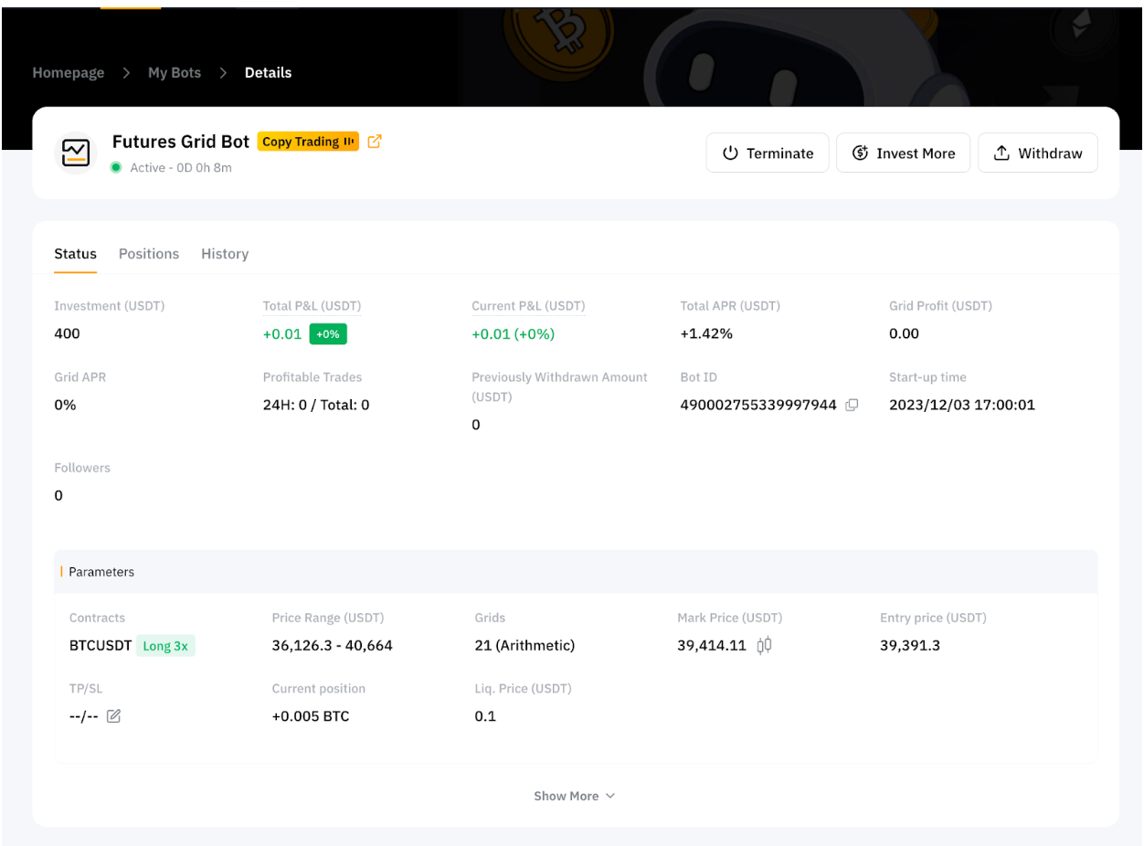 • Nếu bạn đặt TP/SL theo %, khi P&L hiện tại của bạn đạt đến tỷ lệ phần trăm đã đặt, bot của bạn sẽ bị chấm dứt và vị thế của bạn sẽ bị đóng theo giá thị trường.
