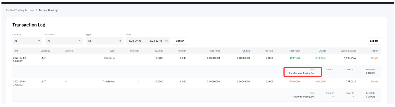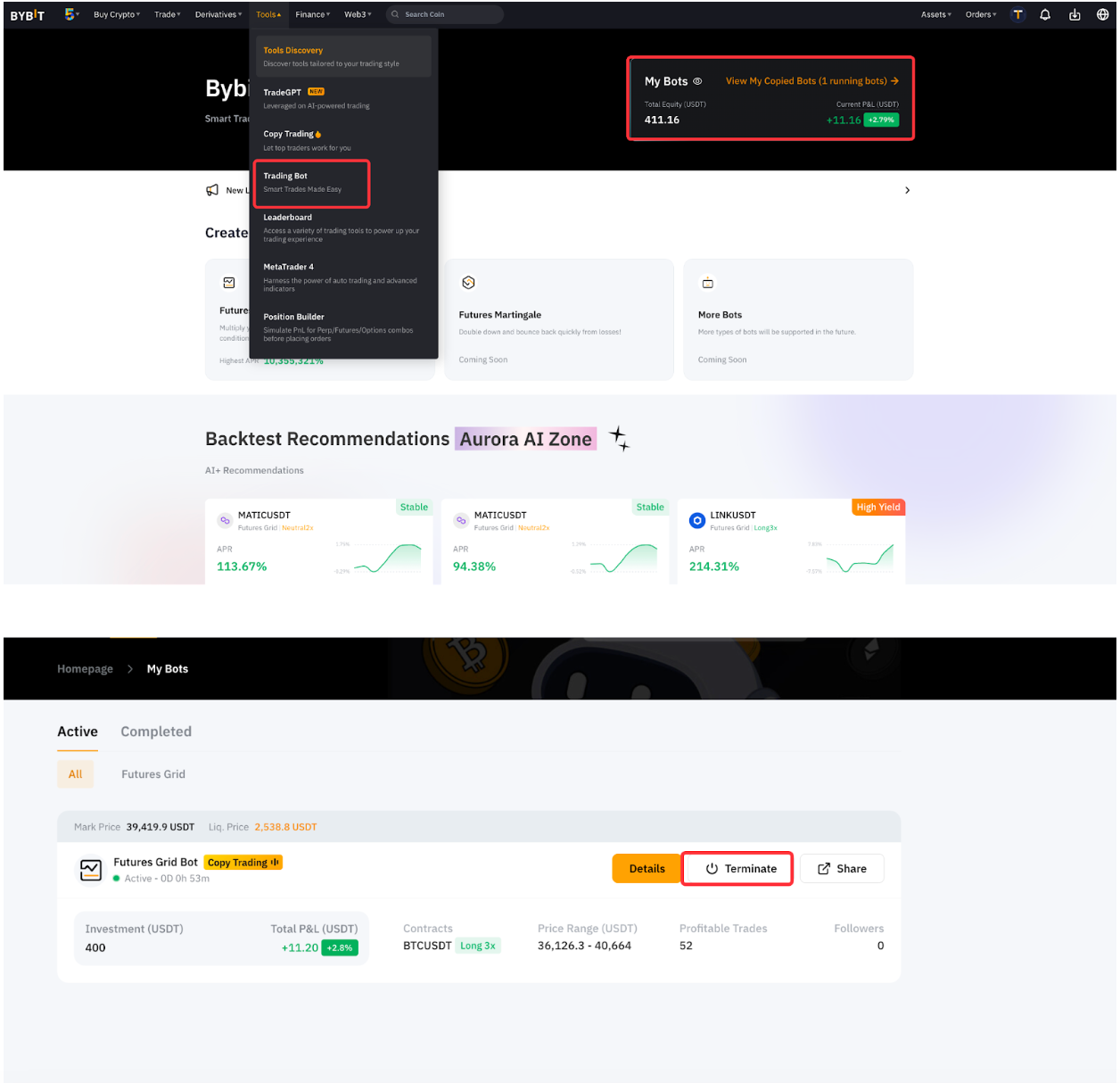 Sau khi bạn chấm dứt bot, tất cả các lệnh đang chờ xử lý của bạn trong bot sẽ bị hủy và các vị thế của bạn sẽ bị đóng theo giá thị trường hiện tại. Tiền sẽ được trả lại vào Tài Khoản UTA (đối với người dùng UTA) hoặc Tài Khoản Phái Sinh.