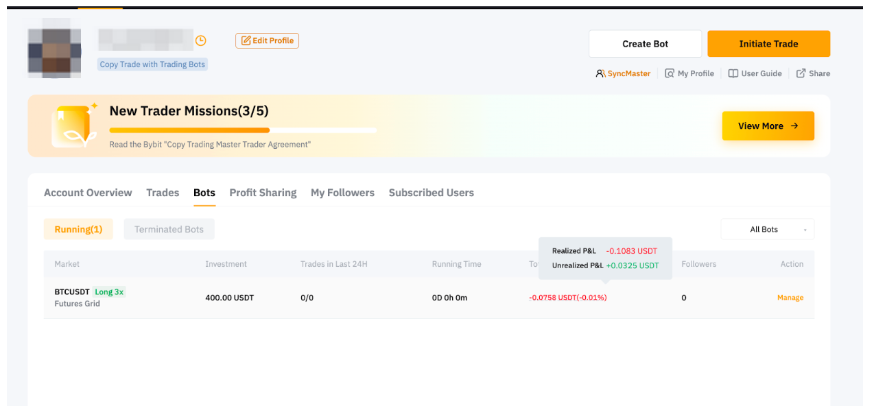 Trên trang Trung Tâm Người Dùng, bạn có thể truy cập BotĐang Chạy để xem bot đang hoạt động. Trên trang này, bạn có thể xem số tiền đầu tư vào bot, thời gian hoạt động của bot và tổng lãi lỗ hiện tại. Để xem thêm chi tiết, hãy nhấp vào Quản Lý, thao tác này sẽ đưa bạn đến trang chi tiết của bot tương ứng.