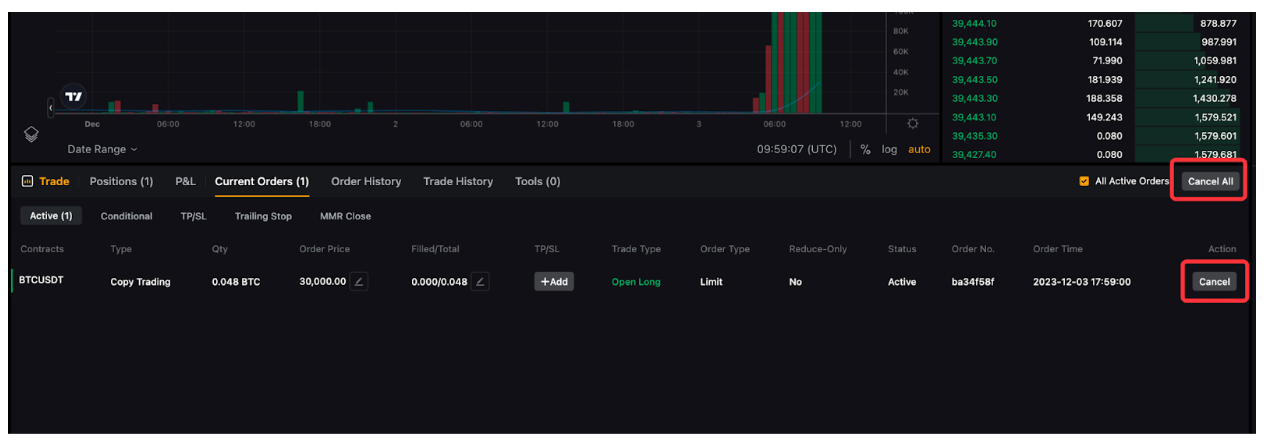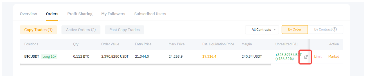 Tiếp theo, bạn có thể xem chi tiết vị thế hoặc lệnh trong Sao Chép Giao Dịch hoặc Lệnh Đang Mở, tại các trang Trang Giao Dịch Phái Sinh hoặc Trung Tâm Người Dùng (Nhà Giao Dịch Chính)Lệnh.  Cả hai trang sẽ trình bày cùng một dữ liệu.
