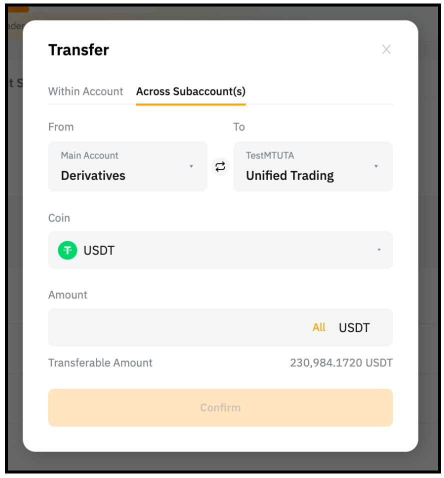 Bạn sẽ cần chuyển tiền vào Tài Khoản Phái Sinh hoặc Tài Khoản UTA (dành cho người dùng UTA) trong Tài Khoản Phụ Nhà Giao Dịch Chính của bạn.