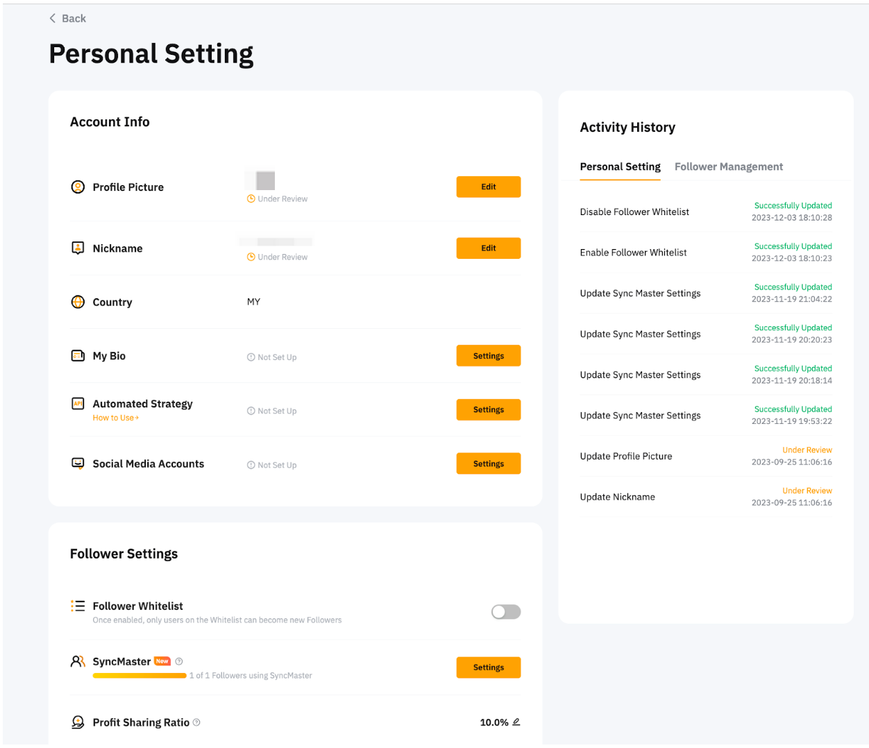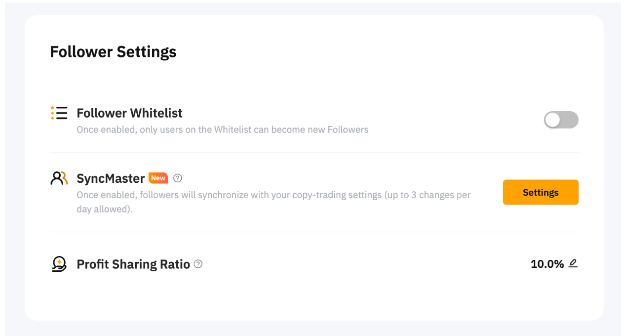 Trong Cài đặt người theo dõi, bạn có thể quản lý Whitelist người theo dõi, SyncMaster và Tỷ lệ chia sẻ lợi nhuận.