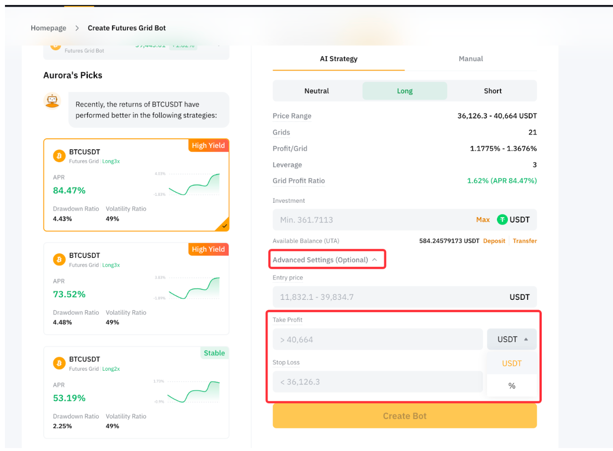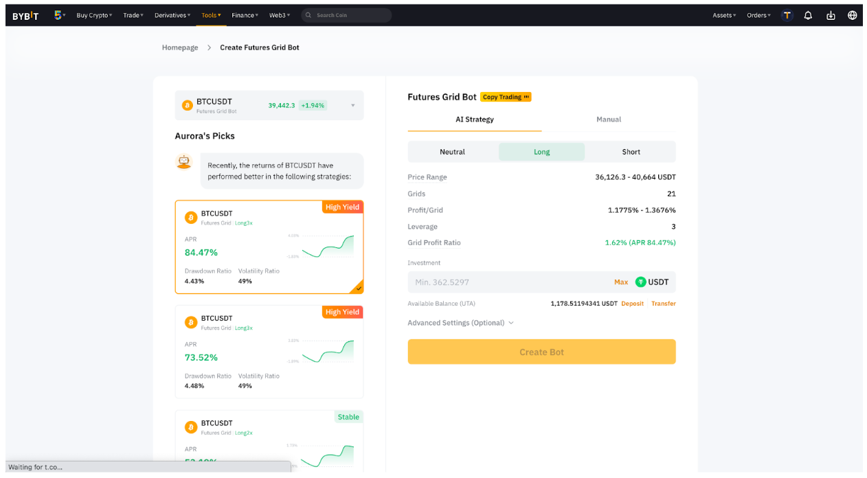 Bot giao dịch: Sau khi nhấp vào Tạo Bot, bạn sẽ được chuyển hướng đến trang tạo Grid Bot Phái Sinh. Bạn có thể làm theo các chiến lược được đề xuất do Aurora AI của Bybit tạo ra hoặc bạn có thể tùy chỉnh các thông số bot của mình ở bên phải. Để tìm hiểu thêm về Grid Bot Phái Sinh, vui lòng truy cập tại đây