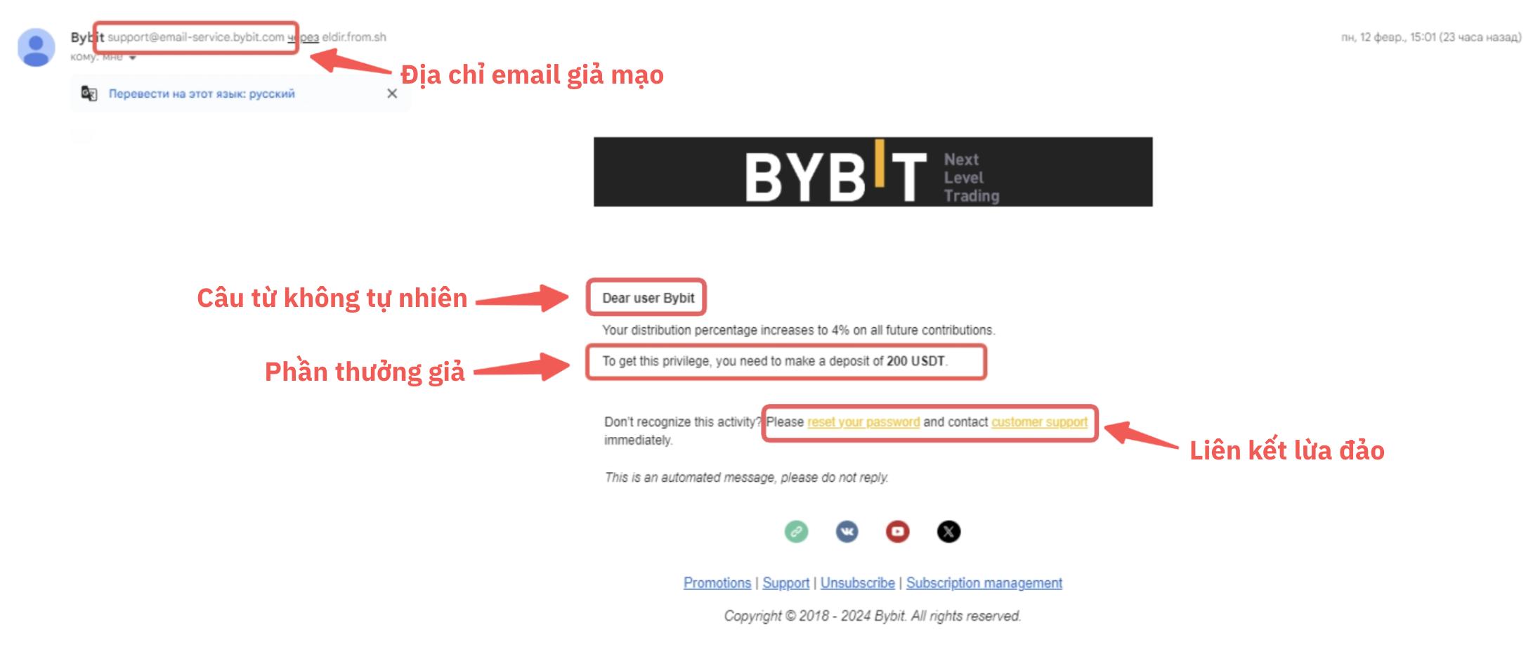 Xác minh thông tin liên hệ của người gửi (ví dụ: địa chỉ email, số điện thoại, URL trang web, v.v.) so với các kênh chính thức hợp pháp của Bybit bằng cách tìm kiếm bất kỳ sự không nhất quán hoặc yếu tố đáng ngờ nào.
