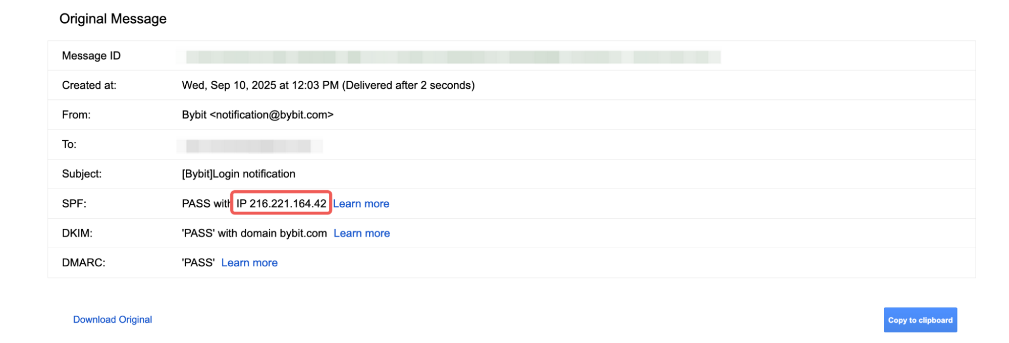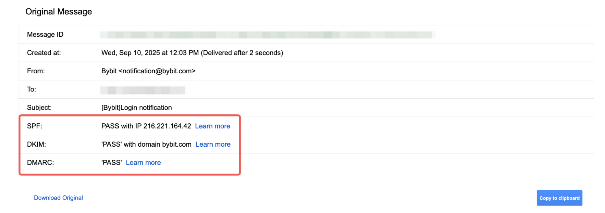 Như đã đề cập ở trên, ngay cả khi kết quả xác minh là chính thức, thông tin liên hệ của người gửi có thể dễ dàng bị giả mạo bằng các kỹ thuật giả mạo. Dưới đây là một ví dụ điển hình cho thấy cách kẻ lừa đảo che giấu và giả mạo địa chỉ email của người gửi để chiếm đoạt tài sản từ người dùng Bybit.