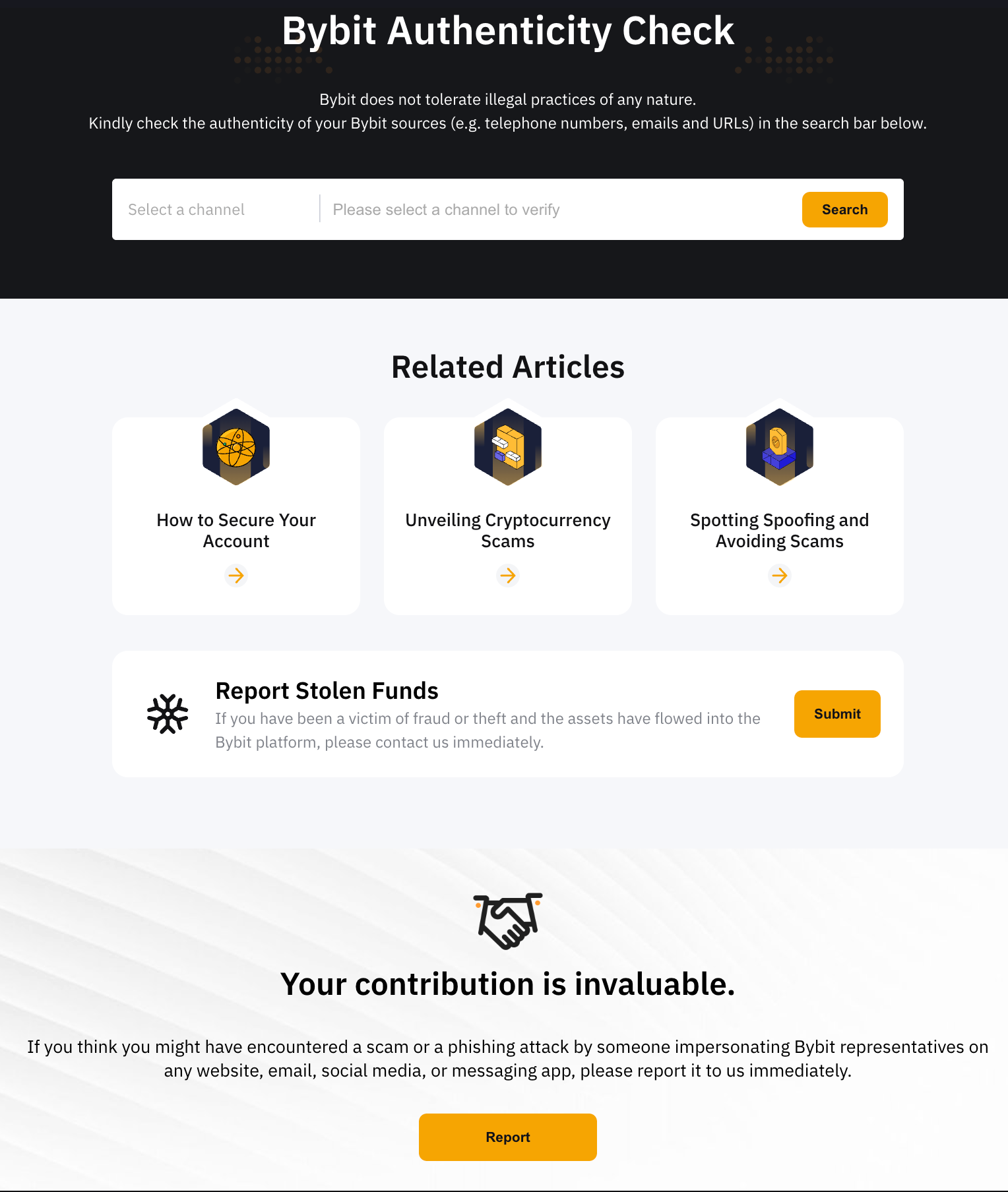 Nếu bạn nghĩ rằng mình có thể đã gặp phải một vụ lừa đảo hoặc tấn công lừa đảo bởi một người mạo danh đại diện của Bybit trên bất kỳ trang web, email, mạng xã hội hoặc ứng dụng nhắn tin nào, vui lòng cảnh báo chúng tôi theo một trong những cách sau: