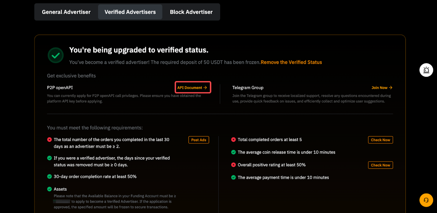 通过扩展 API 访问,您可以根据您的 API 关键性能设置管理您的 P2P 广告和订单。