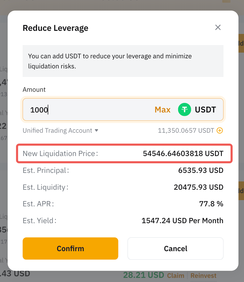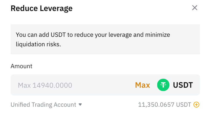 请注意,您可以追加的 USDT 最大金额属于杠杆贷款的一部分。当您添加最大金额时,您的仓位杠杆将降低至 1 倍。
