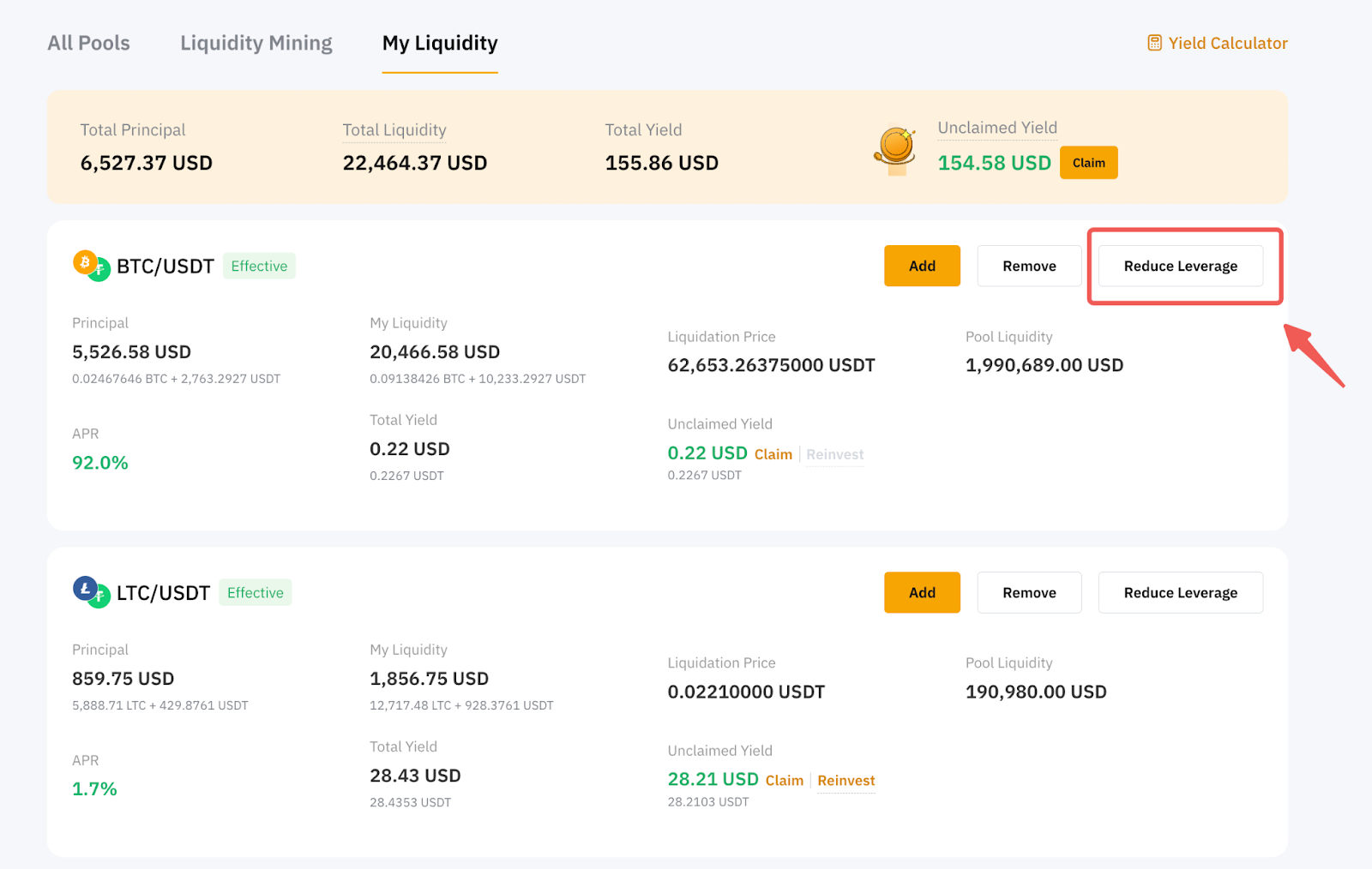 第一步:前往我的流动性页面,点击更多 –> 降低杠杆,进入降低杠杆页面。