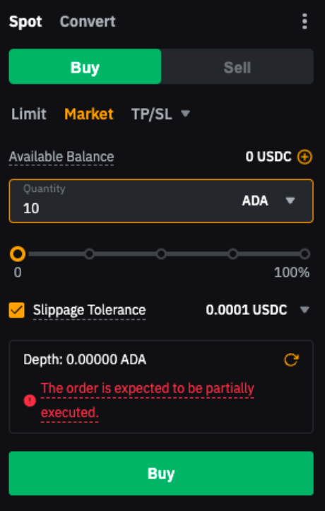 未启用滑点容差时,您的市价单将作为标准市价单执行,滑点不受限制。