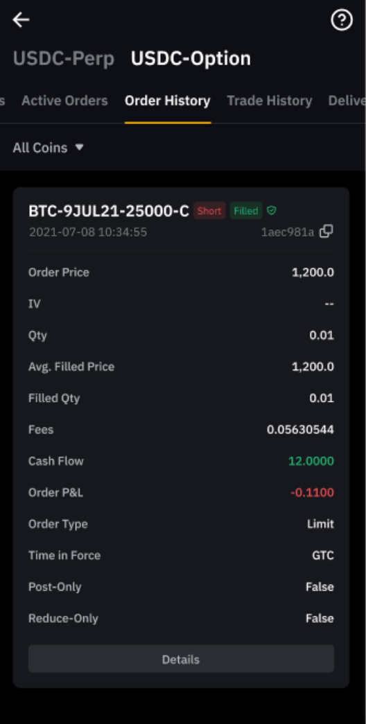 您可以進入訂單記錄,查看保護訂單詳情,或進入 UTA 交易記錄,查看透過永續保護購買的期權的結算詳情。